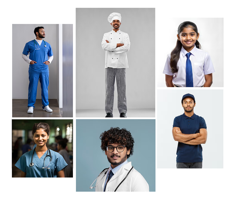 Our wide product range includes school uniforms, medical uniforms, lab coats, scrub suits, doctor coats, security uniforms, chef coats, corporate T-shirts, and industrial uniforms.